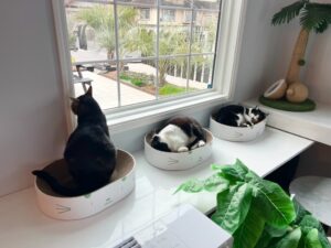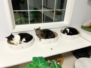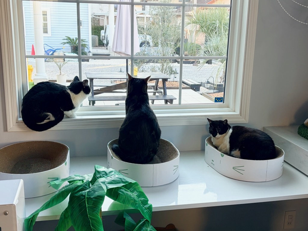最近はこの窓辺がにゃんこ社員達のお気にいりです。毎日ニャルソックしてくれています。